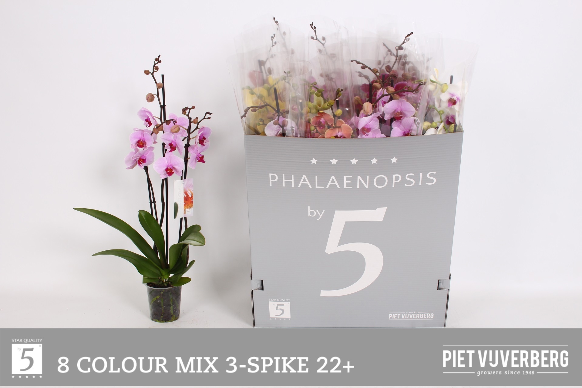 Farbe - Topfgröße 12 Cm Kolli 2 Mindestpflanzenhöhe 70 Cm Inhalt 12 Mindestanzahl an Blumen/Blütenständen im Topf 22 Anzahl 24 Altersreife 2-3 Verpackungs code 352 Minimum Number of Branches Per Plant 3 Mindestanzahl der Zweige/Blütenstände 50% Vertakt Herkunftsland NL Qualität A1 Züchter Kw. Piet Vijverberg -,--≥ {STUKs} Stücke -,--Phalaenopsis Mix 8 Kl 3 Tak 22+
